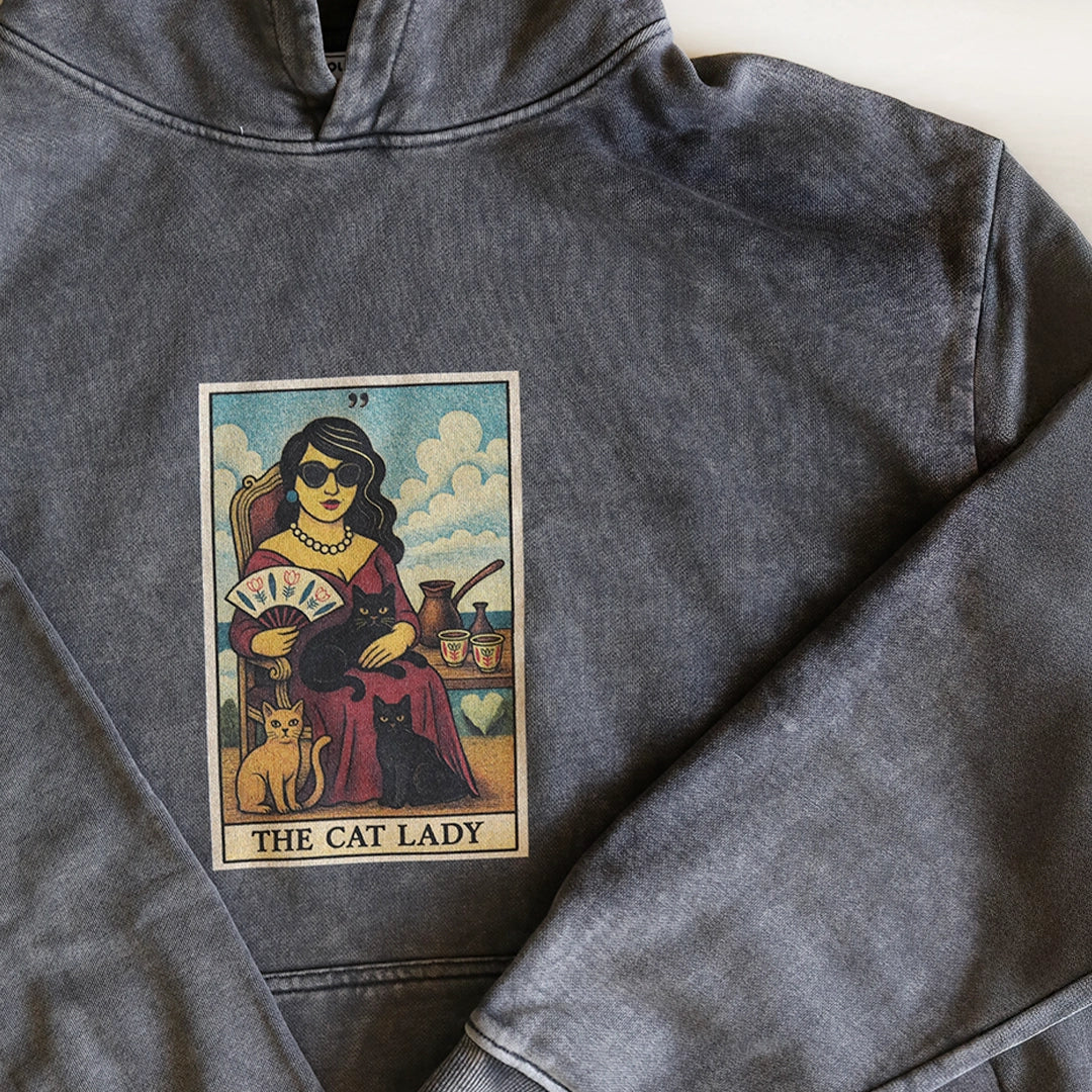 Tarot-style artwork featuring the iconic Em El Nash cat-lady print